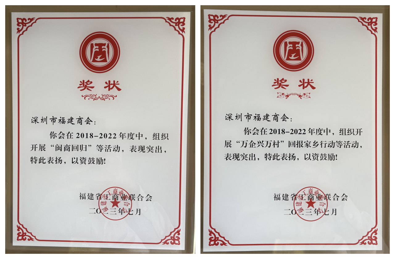 深圳市福建商会获评“闽商回归”工作突出商会和“万企兴万村”回报家乡行动表现突出商会!监事长吴志民、执行会长兼秘书长林炜坚代表商会接受荣誉。