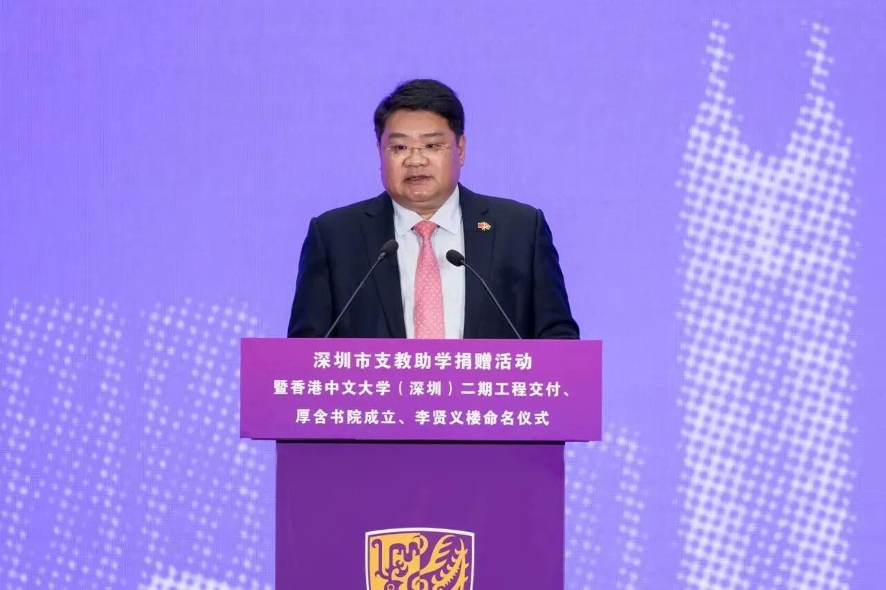 9月8日上午,深圳市支教助学捐赠活动暨香港中文大学(深圳)二期工程交付、厚含书院成立、李贤义楼命名仪式于港中大(深圳)礼文堂举行,深圳市委副书记、市长覃伟中,深圳市政协原主席,深圳市委常委、市政府党组成员郑红波,深圳市政协副主席吴以环,深圳市政府秘书长、办公厅主任高圣元,中国工程院院士、香港中文大学(深圳)校长徐扬生,深圳鹤玺实业董事长乔雪,我会创会会长、信义集团董事局主席李贤义等领导、嘉宾出席了本次活动。