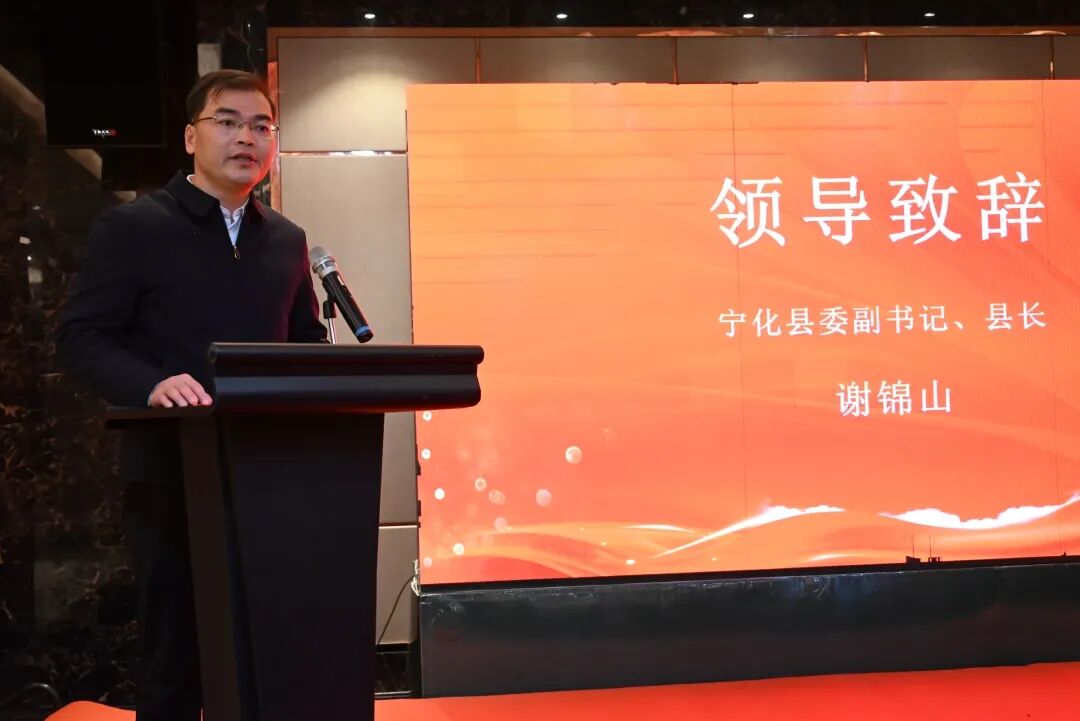 宁化县县长谢锦山致辞。他表示,宁化是一块投资热土、兴业福地。希望各位企业家通过考察,深刻感受宁化的文化魅力、生态优势和发展热忱,期待大家能够融入、支持、投资宁化。也将以最优惠的政策、最优越的环境、最优质的服务,全力支持广大投资者在宁化创业、兴业。