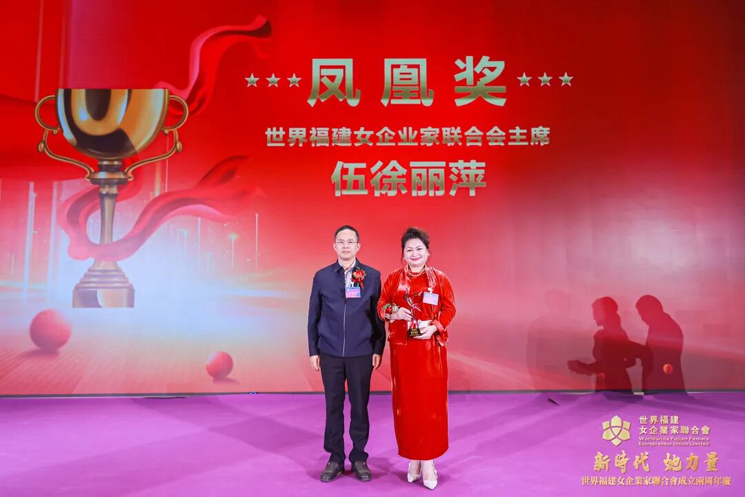 福建省人民政府驻深圳办事处主任翁坤明为世界福建女企业家联合会主席、深圳市福建商会执行会长、深圳市福建商会妇委会主任伍徐丽萍颁发凤凰奖