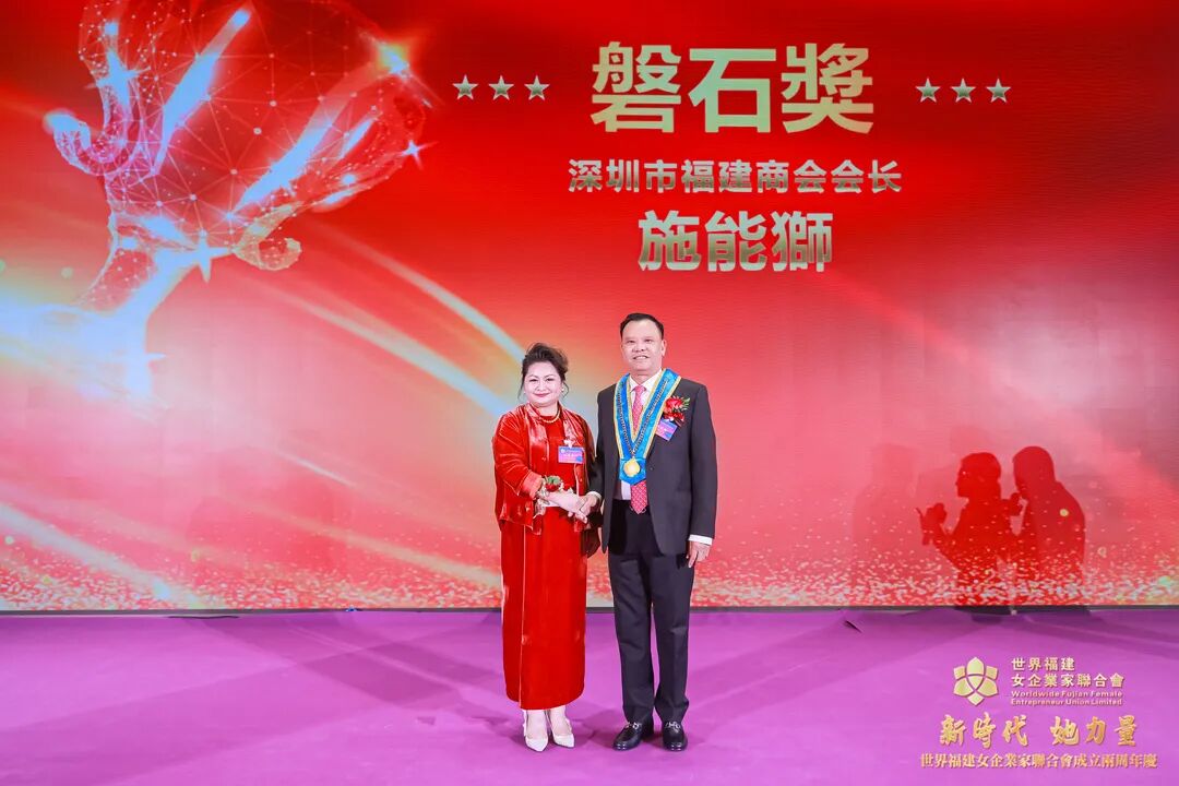 世界福建女企业家联合会主席伍徐丽萍为福建省政协常委、深圳市福建商会会长、联会首席顾问施能狮颁发磐石勋章