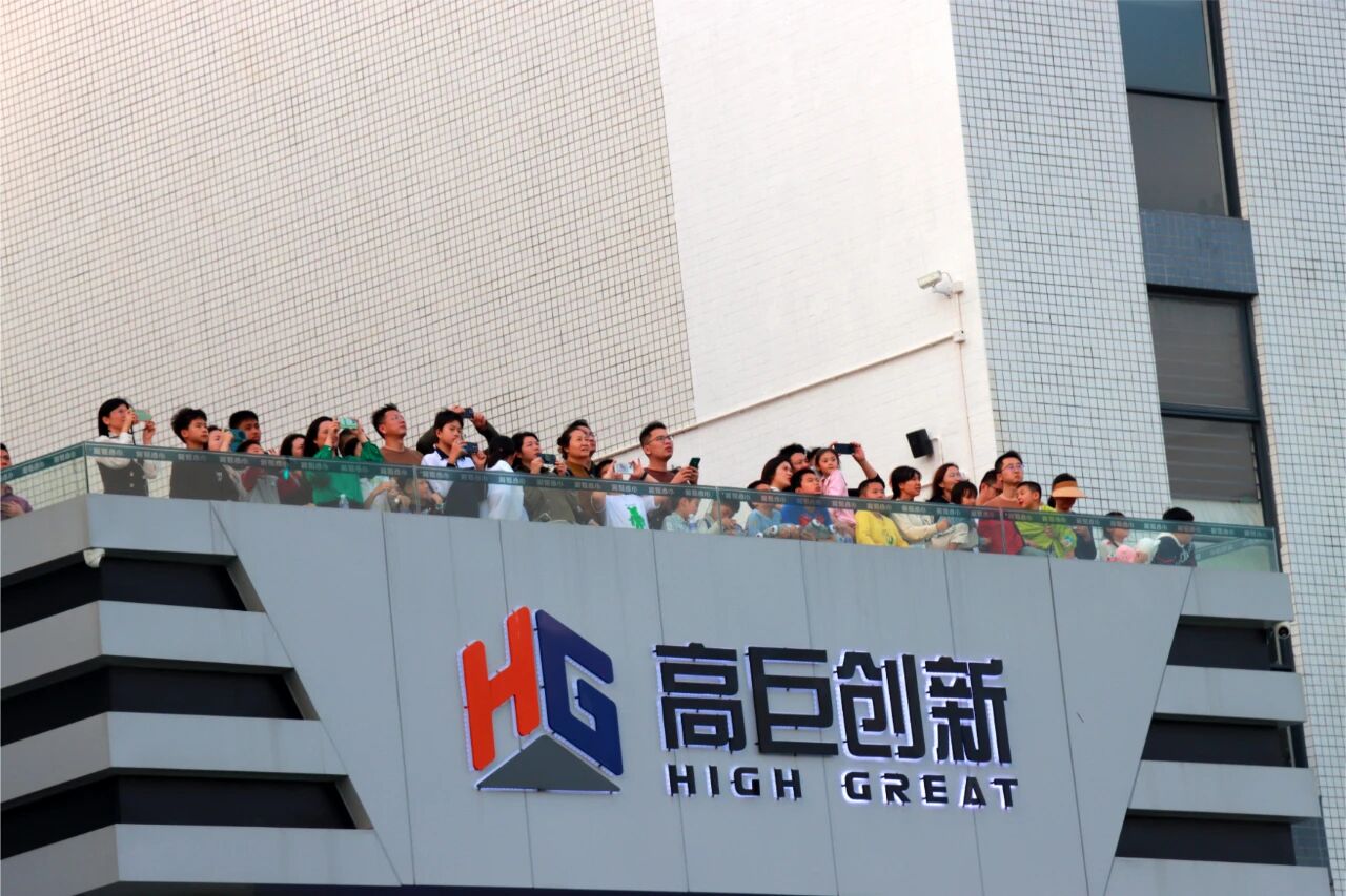 最后,参访人员齐集基地三楼的观景台,共赴一场的美轮美奂的视觉盛宴:高巨创新100架无人机现场起飞,不时变换阵型,形成各种立体图形,无人机的星芒与天空相得益彰,不时引来啧啧称赞,让人叹为观止!