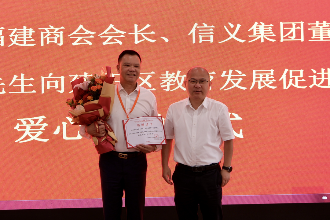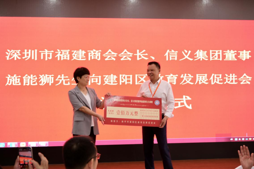 建阳考察活动中,施能狮会长个人向建阳区教育发展促进会捐赠教育发展基金100万元!捐赠仪式上,谢启龙向施能狮颁发了捐赠证书,感谢施能狮热心支持建阳区教育事业发展,建阳区教育发展促进会表示将秉承奖教励学、提质增效,聚贤兴教、润泽桑梓宗旨,将教育资金用于开展济困助学、爱心帮扶、奖教励学等活动。