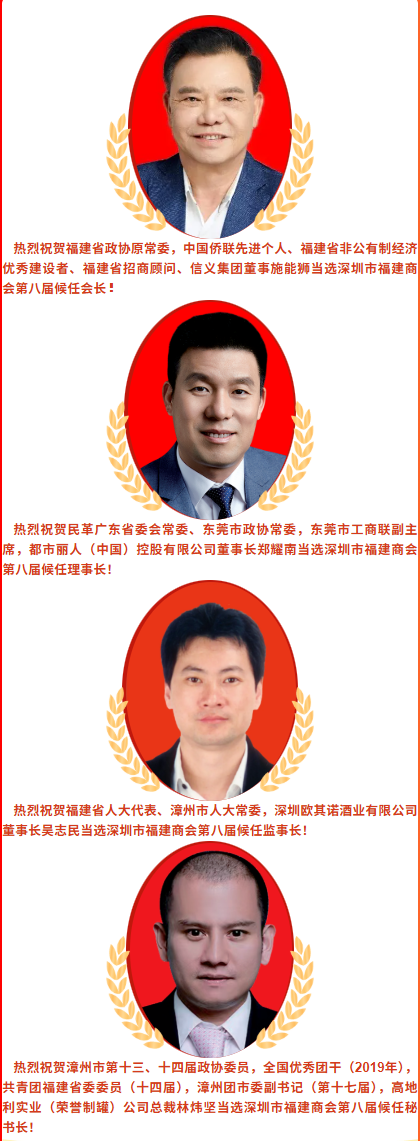 会议全票选出深圳市福建商会第八届候任会长为福建省政协原常委,中国侨联先进个人、福建省非公有制经济优秀建设者、福建省招商顾问、信义集团董事施能狮!