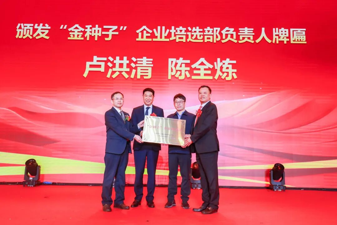 福建省人民政府驻深圳办事处翁坤明主任与施能狮会长为“金种子”企业培选部负责人颁发牌匾。